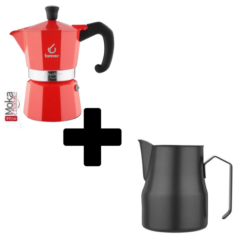 FOREVER - La Rossa- kávéfőző - 6 adagos - piros + Latte art black tejkiöntő - 350 ml - matt fekete